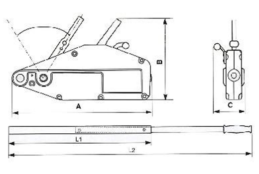 型號(hào) 額定載荷 額定載荷時(shí)手拉力 額定載荷時(shí)手柄往復(fù)一次鋼絲繩行程 鋼絲繩直徑 葫蘆重量 外形尺寸